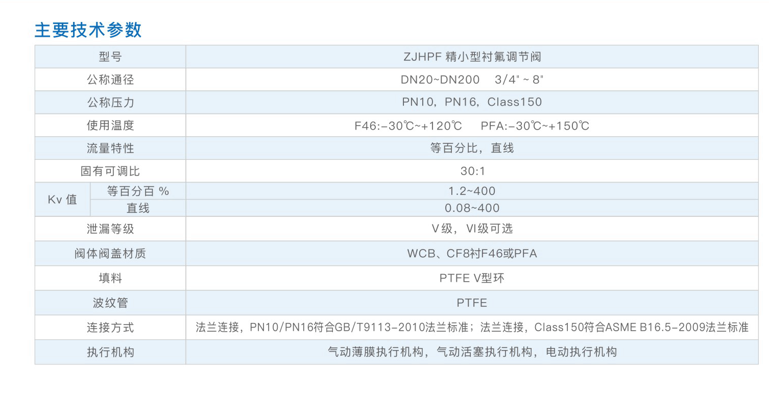 ZJHPF精小型衬氟调节阀与介质接触的部位均采用高压注塑工艺,衬有能耐腐蚀、耐老化的聚全氟乙烯(F46)或PFA,填料函密封采用聚四氟乙烯波纹管密封。该产品耐腐蚀性好、使用寿命长、安全可靠且维护方便,广泛用于化工、石油、冶金、医药、电力等行业中对酸、碱等强腐蚀介质和有毒、易挥发等气体、液体介质的过程控制。