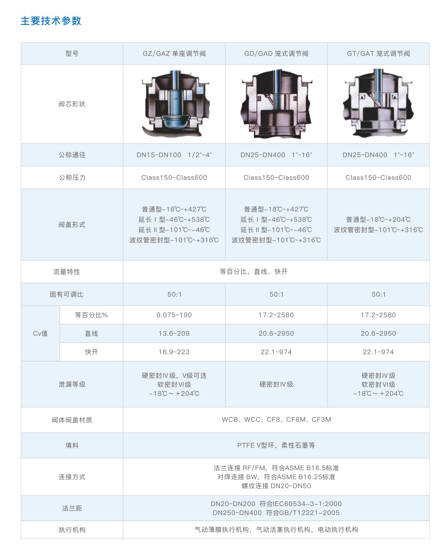G系列高性能调节阀包括GZ/GAZ单座调节阀、GD/GAD笼式调节阀和GT/GAT笼式调节阀,该产品是在消化吸收国内外的设计技术、丰富的制造经验及先进的的设计结构基础上研发而成的,专为多种工况而设计,阀内件具有互换性,维护简单,操作方便。除具备气动仪表的共同特点外,该系列调节阀还具有动作可靠,流量特性精确,可调范围宽,操作稳定,调校简单、阀座泄漏量小等突出特点。它适用于一般流体介质的工艺过程控制,广泛地应用于发电、石油、化工、轻工等工业部门。